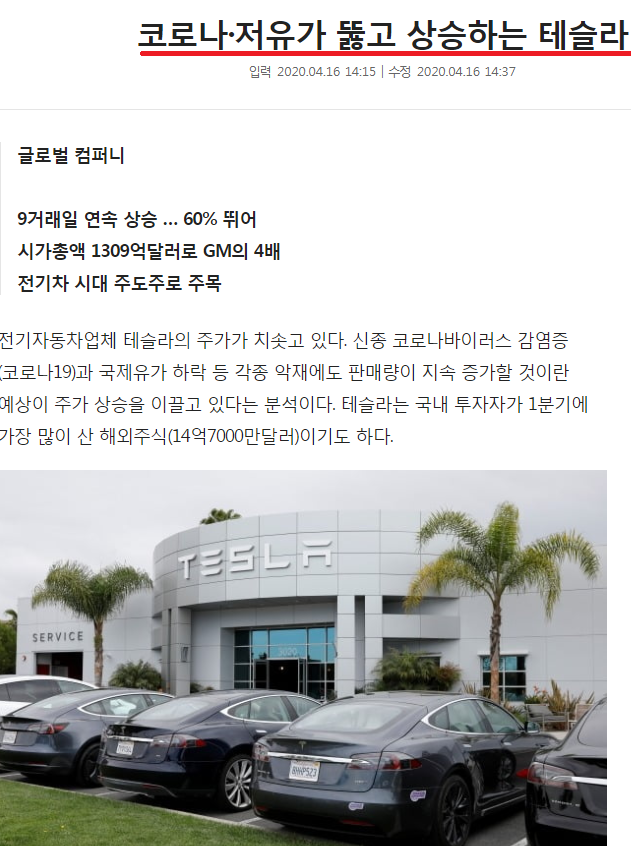 코로나, 저유가 뚫고 상승중인 테슬라 주가!!