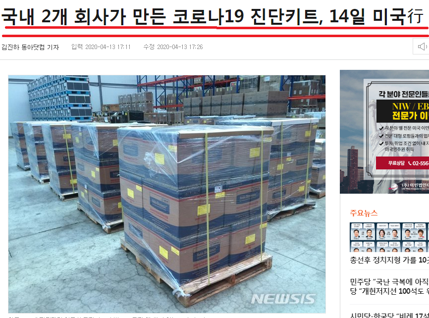 4월 13일 속보로 전하자면 14일 코로나 19 진단키트가 미국으로 운송