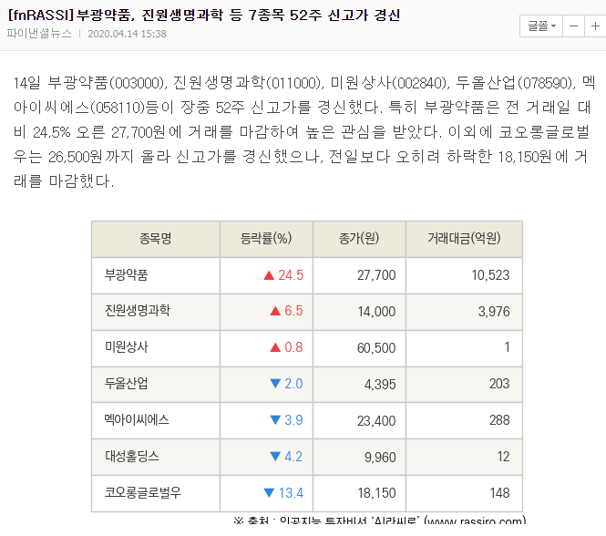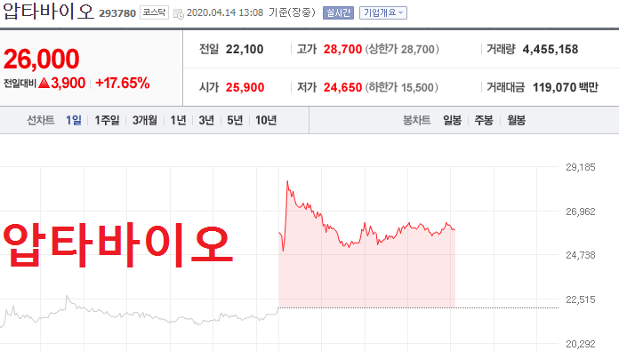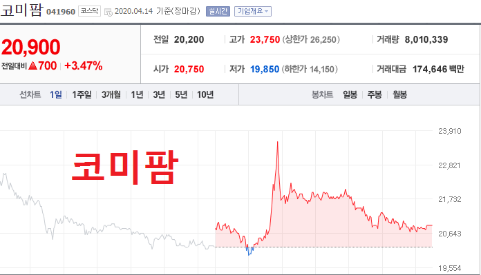 코로나 19 치료제 관련주 코미팜 4월 14일 전일가 기준 약 4% 상승