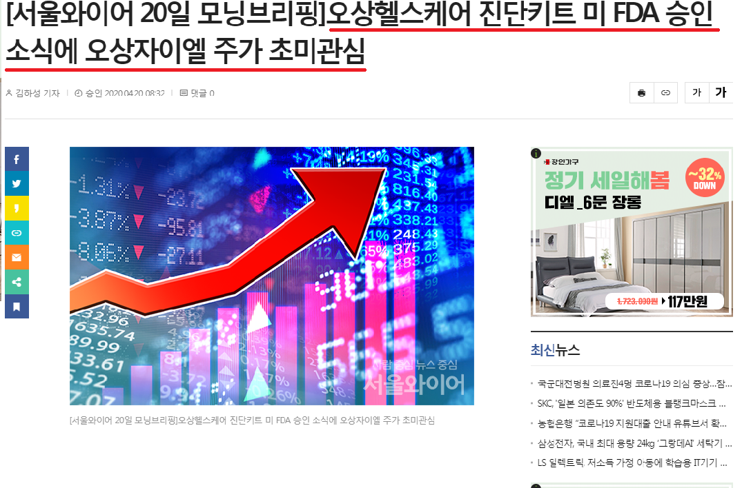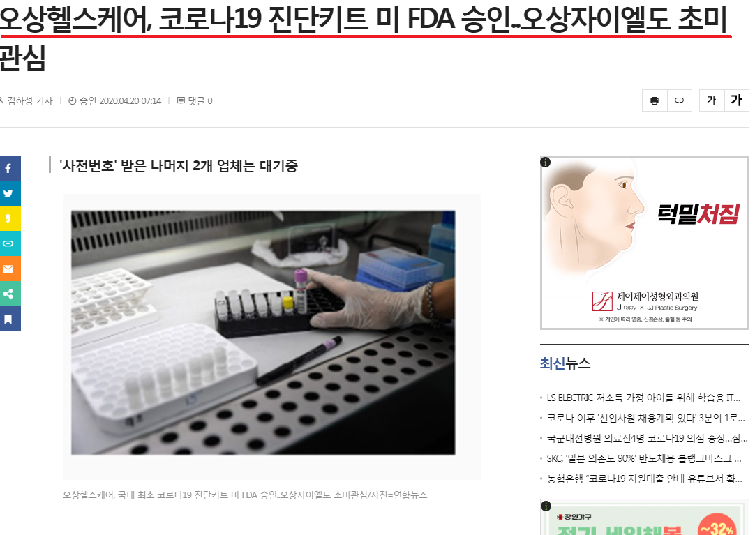 19일 미국 FDA는 현지 시각으로 18일 홈페이지에 오상 헬스케어가 제출한 긴급사용 신청을 승인한다고 공지