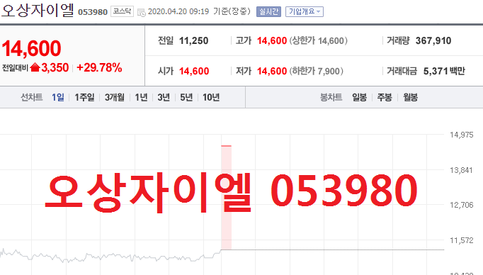 4월 20일 9시 장시간 기준, 장이 시작되자마자 상한가인 14,600원을 바로 찍어버리는!!
