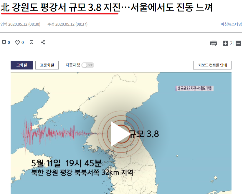 12일 북한 강원 평강 북서쪽 37KM서 3.8 규모의 지진 발생