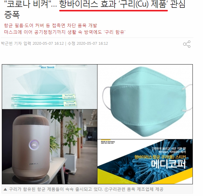 " 코로나 19 바이러스 차단 물질 구리 효능 입증!!, 구리 이용한 제품들 관심도 상승 "