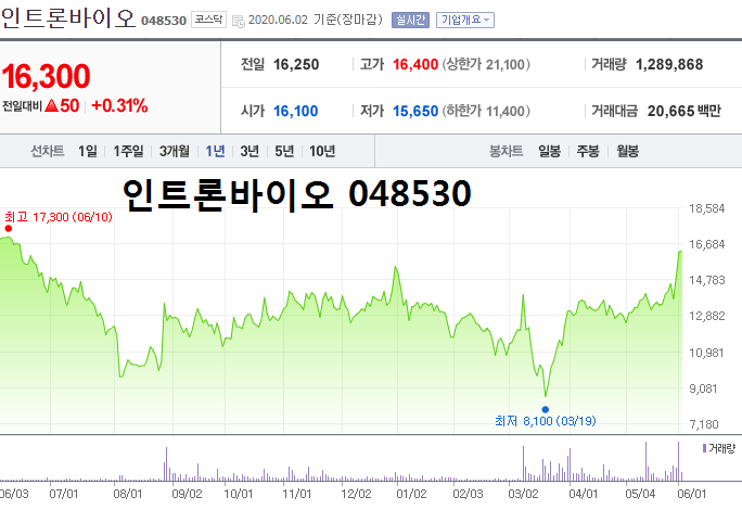 - 2020.04.23 인트론바이오, 난치성 감염질환 치료 바이오신약 후보물질 확보