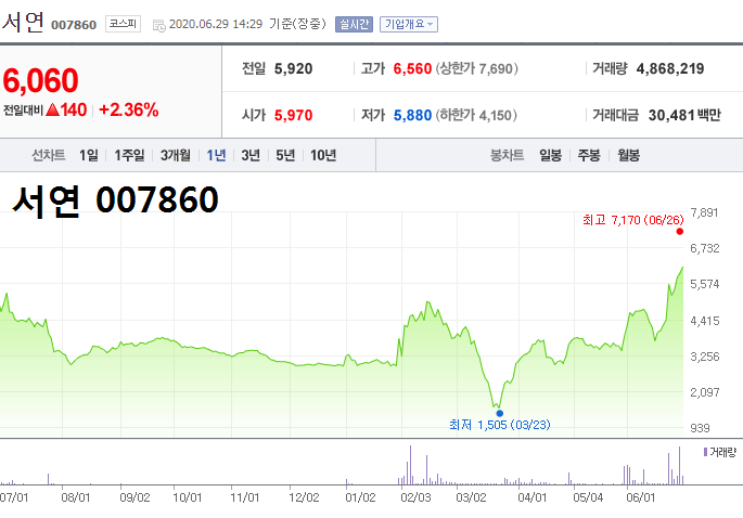 - 2020.06.26 윤석열 관련주 서연, 17.47% 급등.. 신고가 경신
