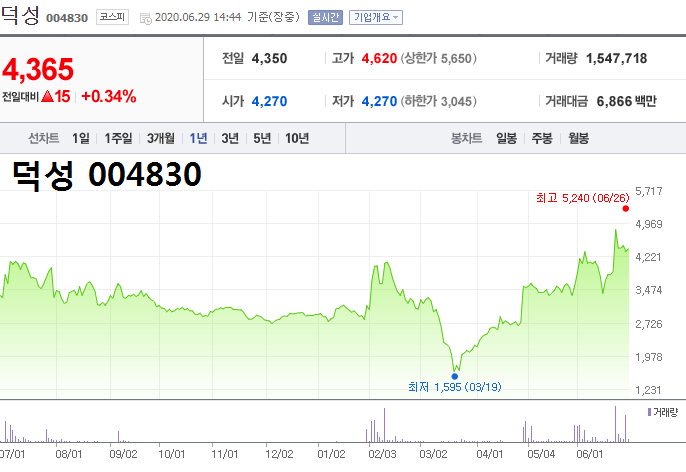 - 2020.06.26 덕성 12.98% 상승 52주 신고가