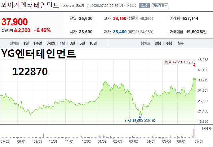 - 2020.06.30 YG 52주 신고가.. 中 한한령 풀리나, 엔터 3사 주가 급등