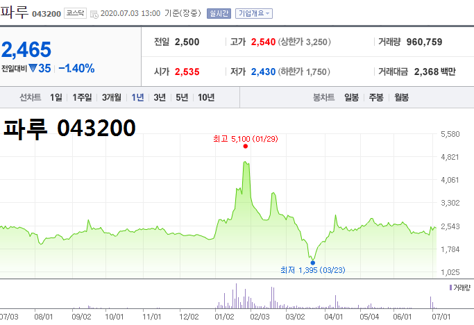 파루는 신재생에너지 전문 기업으로 태양광발전 사업과 첨단 일렉트로닉 기술이 인쇄전자 사업을 하는 기업. 태양광 발전은 추적장치와 고정식으로 전 세계 수출, 손소독제 '플루' 제품을 판매하며 대표적인 손소독제 대장주로도 움직임 부각 이력.