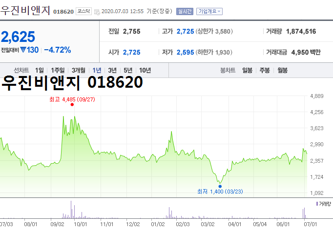 - 2020.07.01 우진비앤지, 중국 돼지독감 바이러스 발견 소식에 강세
