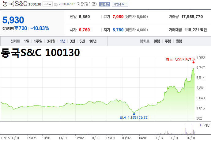 - 2020.06.26 동국S&C, 그린뉴딜 300조 투자 특별법 추진 소식에 급등