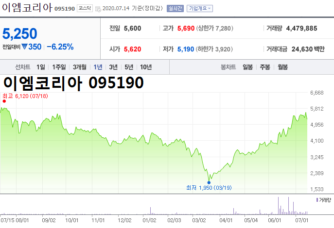 - 2020.06.11 이엠코리아, 그린뉴딜 정책 호재에 강세