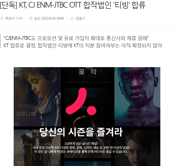 " CJ ENM- JTBE OTT 합작법인 '티빙' 선보여 "