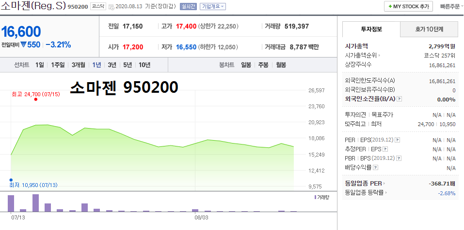 - 2020.08.06 소마젠, 외국기업 1호 기술특례 국내 시장 상장