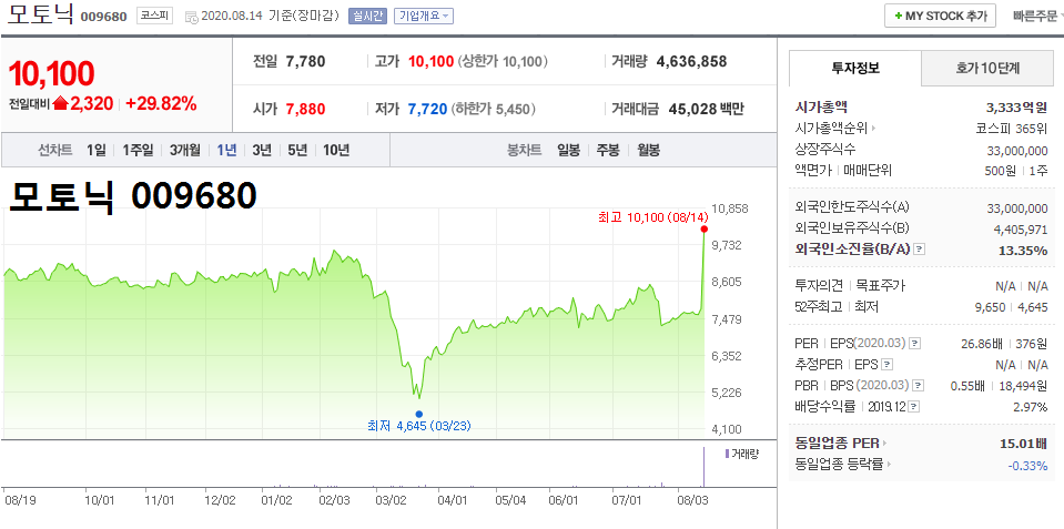 - 2020.08.14 수소차 부품주 '모토닉', 현대차에 핵심부품 3개 독점 제공
