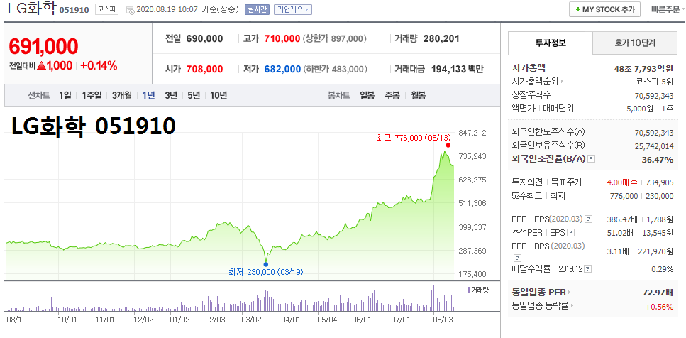 - 최근 하루 만에 시가총액 48조→52조로 4억 원 상승 이력, 지난달 말 LG화학은 2분기 역대 최고 실적을 기록하며 주가 상승세를 타고 3위까지 도약