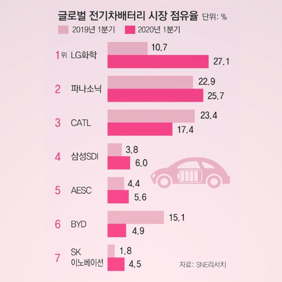 - 국내 1위 화학물질 제조기업으로 석유화학, 전지, 첨단소재, 생명과학 사업 등을 영위하는 회사. 현재 세계 최고 전기차 배터리 생산업체로서 글로벌 전기차 배터리 사용량 1위 파나소닉 제치고 1위로 올라서 메인 공장인 중국 테슬라 공장에 배터리 공급 중.