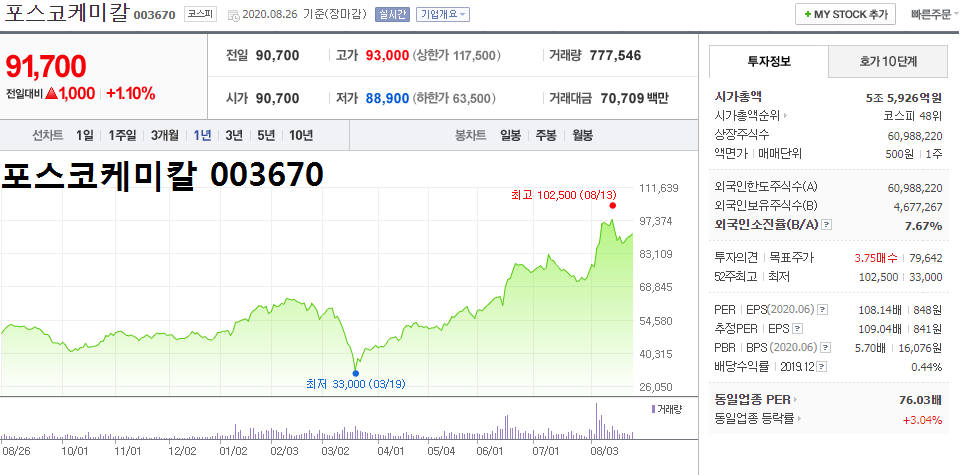 - 2020.08.05 포스코케미칼, 배터리 사업 확대.. 양극재에 3000억 원 투자