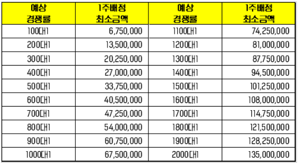 빅히트 경쟁률 별 1주를 배정받기 위한 최소금액을 계산해보겠습니다. 카카오게임즈와 같은 경쟁률을 보일 시 1억이 넘는 돈을 청약증거금으로 투입해야 1주를 배정받을 수 있을 것으로 예상.