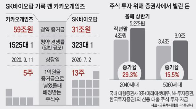 지난 7월 상장한 SK바이오팜은 경쟁률 323:1, 청약증거금 30조 9000억원을 카카오 게임즈는 일반투자자 대상으로 경쟁률 1525:1, 청약증거금 58조 6000억 원을 기록했다. 빅히트 엔터테인먼트는 공모금액 최대 1조 육박(약 9626억 원)