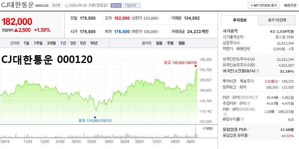 - 2020.09.18 고향은 안 가도 택배는 간다.. CJ대한통운 신고가 행진