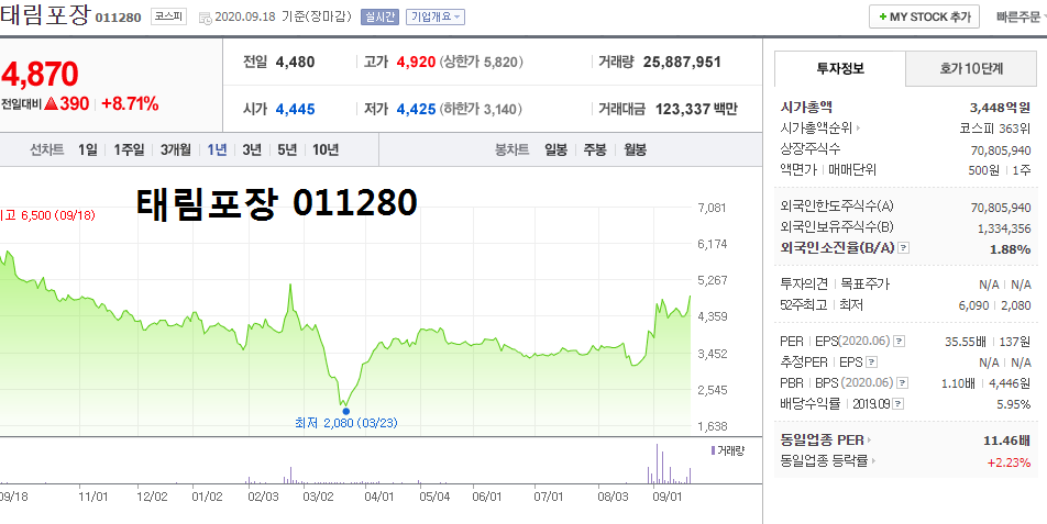 - 2020.09.04 태림포장, 대영포장 주가 장중 급등.. 코로나 19로 택배 상자 수요 늘어