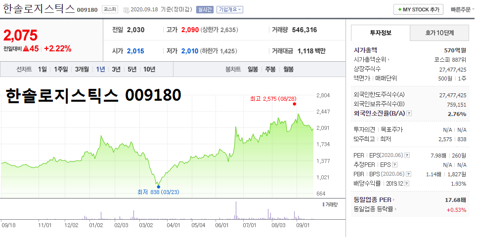 택배 관련주 ▲한솔로지스틱스 009180