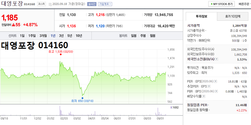 - 2020.09.04 대영포장 주가 장중 급등.. 코로나 19로 택배 수요 늘어