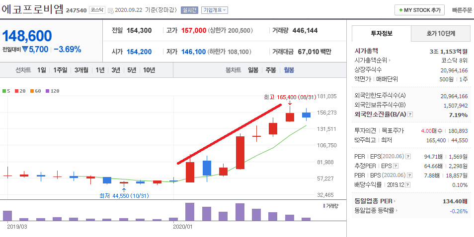 - 에코프로비엠 월봉차트 입니다. 그래도 2020년 이후 월봉차트로서는 꾸준한 상승세를 보다가 현재 약간 정체기 구간이지만 테슬라의 배터리 데이, 정부의 친환경자동차 정책 추진과 더불어 향후 상승세를 보이지 않을까 하는 개인적인 의견입니다.