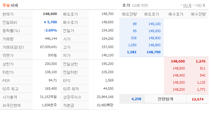 - 9월 22일 거래량은 44만 6천주 가량이 거래되었으며 3.69%가량 떨어진 148,600원으로 마감하였습니다.
