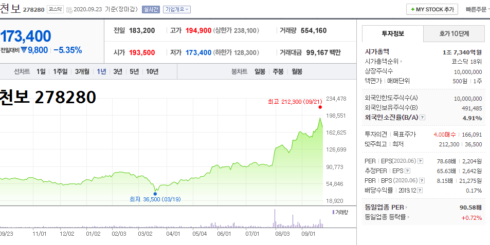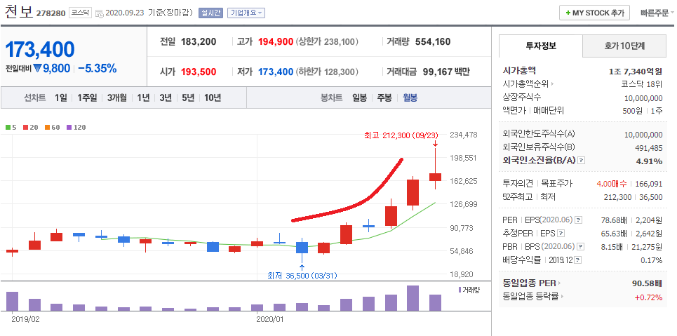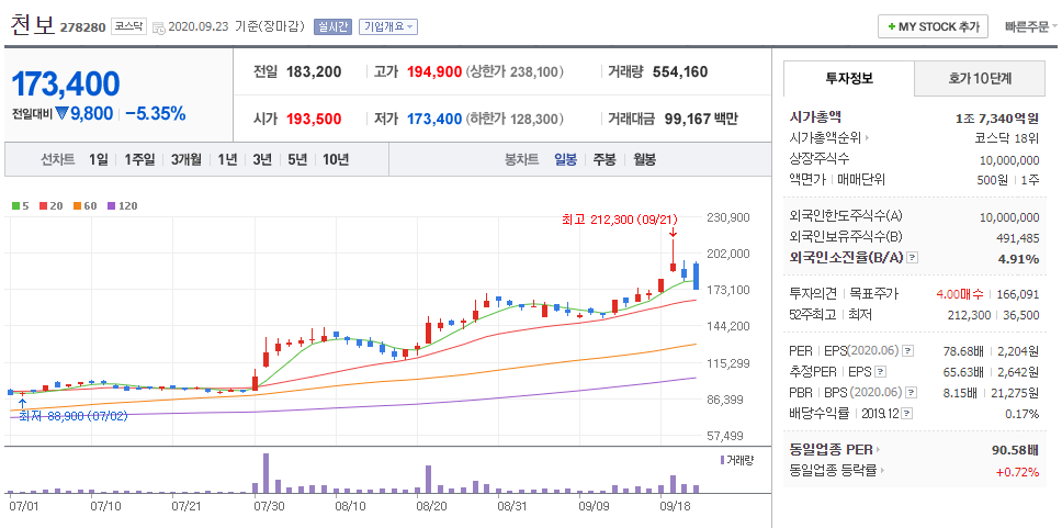- 2020.09.23 천보 278280 일봉 차트입니다.