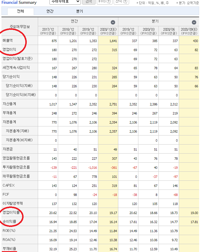 * 2020년 예상 매출액 1,641억 원 / 영업이익 371억 원 / 당기순이익 265억 원으로 안정적인 매출과 우수한 영업이익률, 지속적인 성장률을 보여주는 실적 정보입니다.