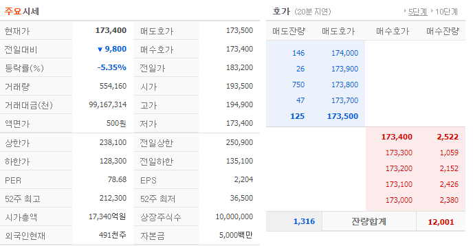 - 9월 23일 거래량은 55만 4천 주가량이 거래되었으며 5.35%가량 하락한 173,400원으로 마감하였습니다.