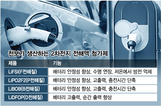 - 천보가 생산하는 F·P·R·D전해질은 2차전지 소재 중 핵심인 전해액의 성능을 향상하는 첨가제다. 전해액 첨가제의 주요 기능은 배터리 수명향상, 충·방전 효율 개선, 저온 방전 억제 등이 있다.