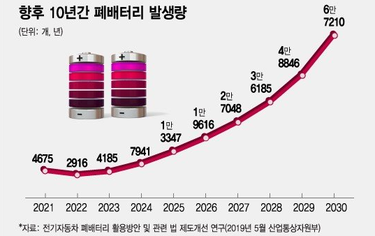 배터리를 중심으로 전기차·수소전기차 등 차세대 모빌리티 시장이 급격히 커져 올 하반기 1400여 개를 시작으로 2030년엔 폐배터리 시장이 연간 6만 7210개 규모로 확대될 전망이다.