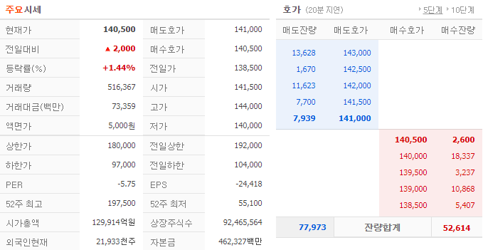- 9월 25일 거래량은 516,367주가량이 거래되었으며 1.44% 상승한 140,500원으로 거래가 되었습니다.