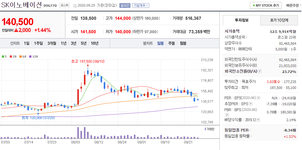 - 2020.09.25 SK이노베이션 096770 일봉차트 입니다.