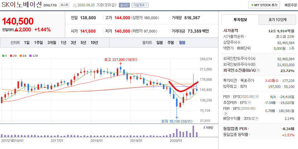 - SK이노베이션 월봉 차트입니다.