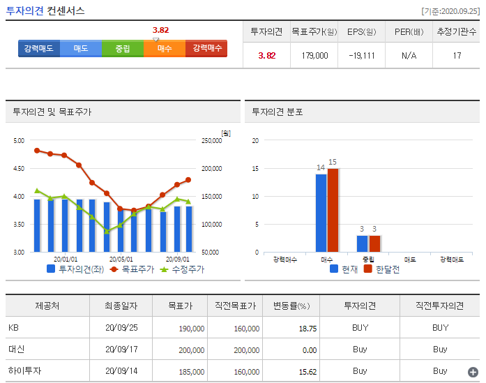 - EPS는 -19,111원이고 투자의견은 3.82인 매수를 추천합니다.