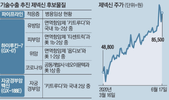 제넥신은 최근 코로나 19 사태 이후 DNA백신으로 개발 중인 'GX-19'로 국내 코로나 백신 개발 관련주로도 굉장히 이슈 있는 종목인데요.