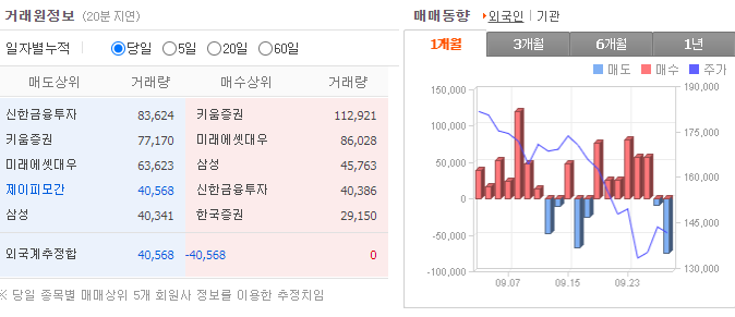 - 9월 29일 거래량은 7056만 주 가량이 거래되었으며 1.38% 하락한 142,800원으로 거래가 되었습니다.