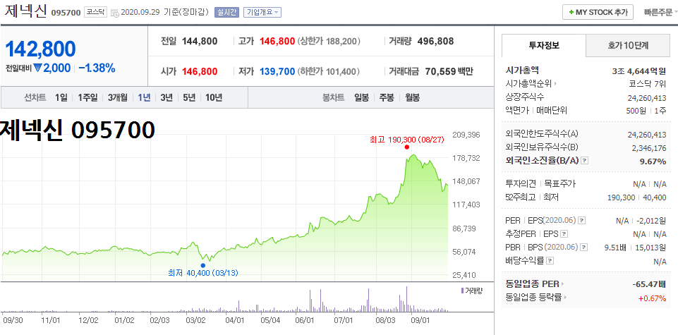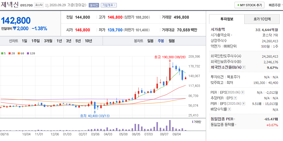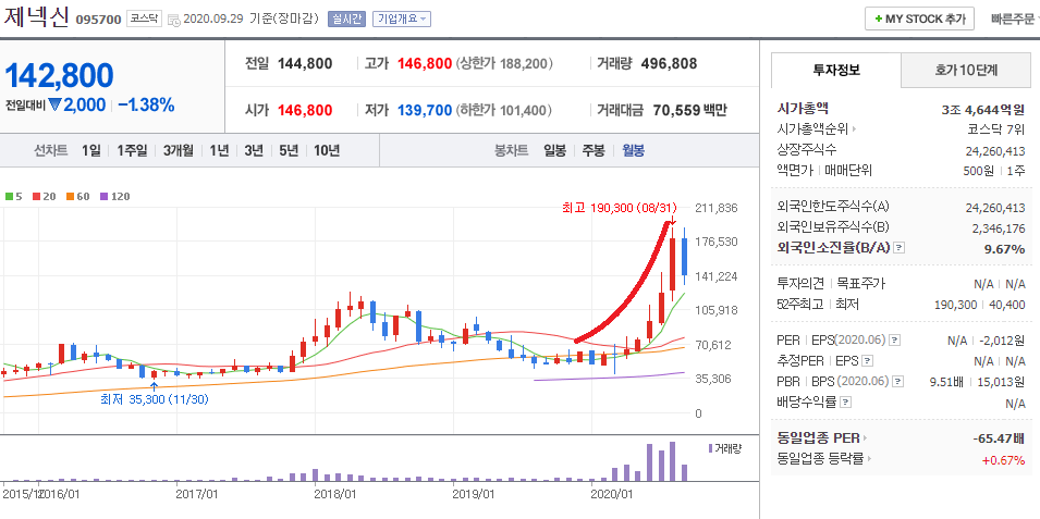 - 2020.09.29 제넥신 095700 일봉차트입니다.