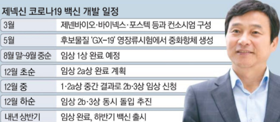 - 제넥신은 올해 GX-19 임상 1/2a를 통해 안전성과 효과를 확인한 뒤 2021년 상반기에 임상 2b/3상을 개시, 대량생산 및 계획을 통해 2022년 국민 대상 접종을 실시할 것으로 예상