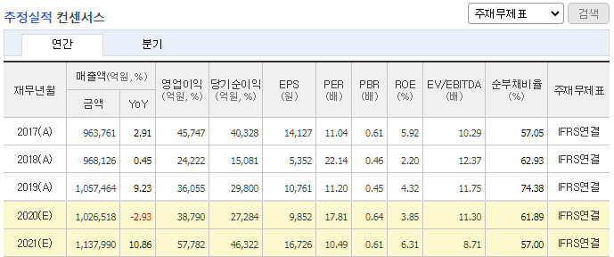 *2020년 예상 매출액 102조 6,518억 원 / 영업이익 3조 8,790억 원 / 당기순이익 2조 7,284억 원