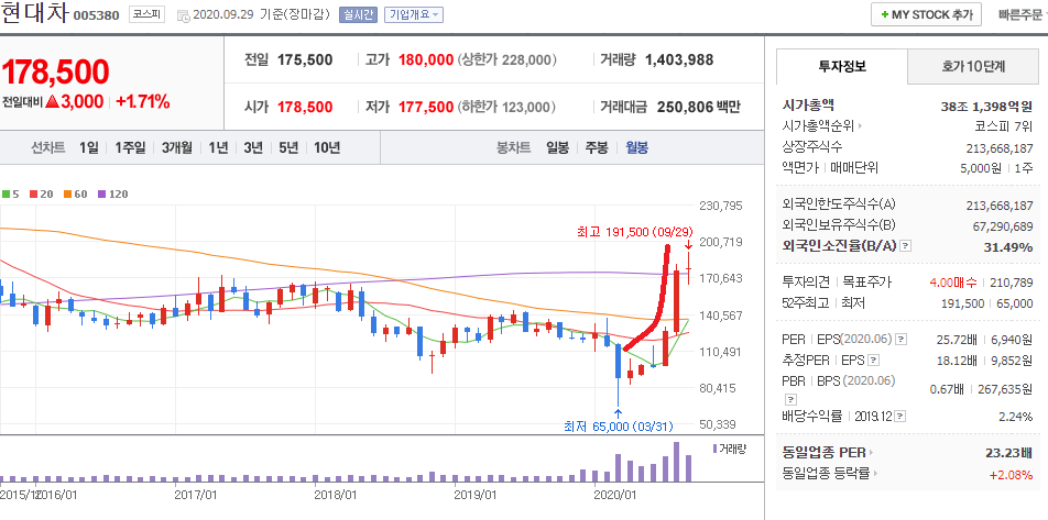 - 2020.09.29 현대차 005380 일봉 차트입니다.