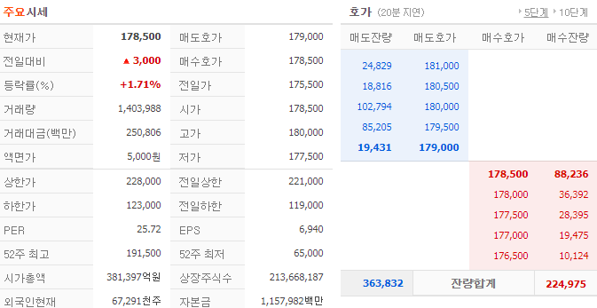 - 9월 29일 거래량은 140만 주 가량이 거래되었으며 1.71% 상승한 178,500원으로 거래가 되었습니다.