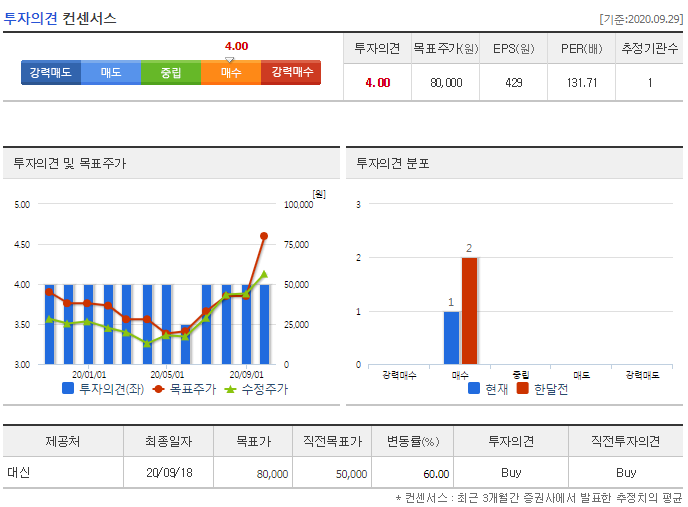 - EPS는 429원이고 PER은 131.71배로 투자의견은 4.00인 매수를 추천합니다.