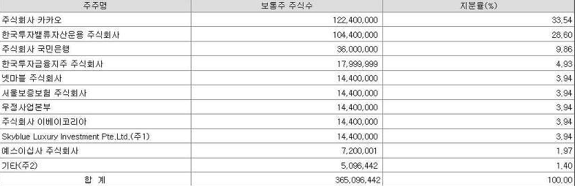 - 카카오 · 소유 주식 수 : 1억 2240만 주 / 지분 : 34.54%