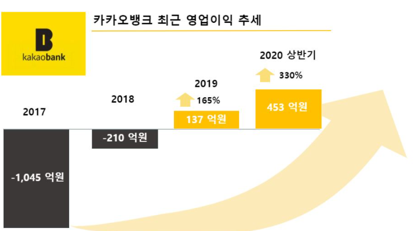 카카오뱅크는 2017년 7월 영업을 시작해 지난해, 3년 차부터 영업이익을 얻게 되며 빠르게 성장하고 있습니다. 올 초 코로나 19 사태로 인해 언택트 사업 환경이 수혜를 얻으며 실적이 가파르게 성장하는 모습을 보이고 있습니다.