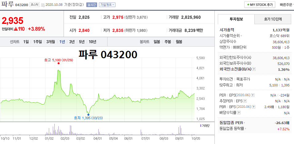 - 파루는 소독기 자동릴(차량 탑재 및 도로에 설치해 공중방역 분사하는 기기), 무인방제기, 병해충 방제기 등을 제작 및 판매 중이므로 아프리카 돼지열병 관련주 움직임 부각