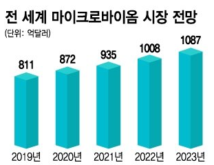 - 마이크로바이옴 기술은 세계적인 관심사다. 글로벌 리서치업체 마켓 앤 마켓을 통해 마이크로바이옴 치료제 글로벌 시장 규모가 연평균 21.9%씩 성장해 오는 2023년에는 6억 4,900만 달러(한화 약 7,550억 원)에 이를 것으로 전망했다.